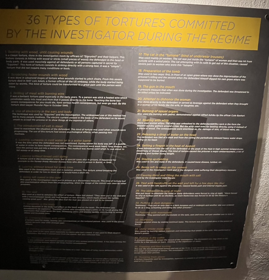 The list of “tortures” done during Enver Hoxha’s regime are horrendous — FAIR WARNING. “Strapping dynamite on the body”, “burning of sexual organs with petrol”, “putting inside the coffin alive”, “crushing breasts with pliers”, “cat with claws put inside underpants of women and then hit with a wood”. These are beyond hurtful.