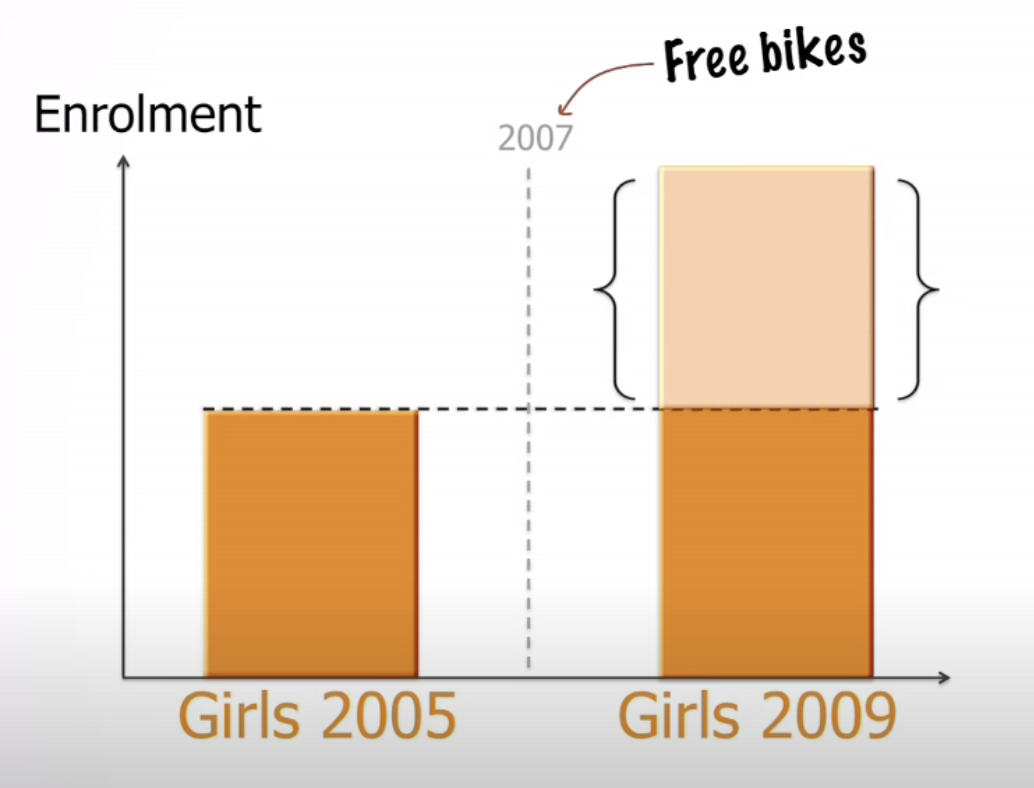 This video explains two things: difference in difference approach of analysing systematic changes and the impact of having a little more freedom in our lives. Once the girls had the bicycles, they could travel to other places and help their parents in errands and jobs. They could go to the next city and open their bank accounts.