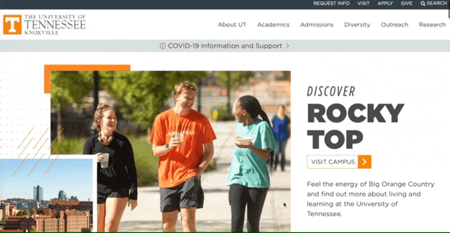 Tennessee’s website is very audience focussed. They aim to have great undergraduate programmes and thus attract the best undergraduate students. Research is not the center of the world. It is lost in a hyperlink about “Dig deeper with research opportunities”.