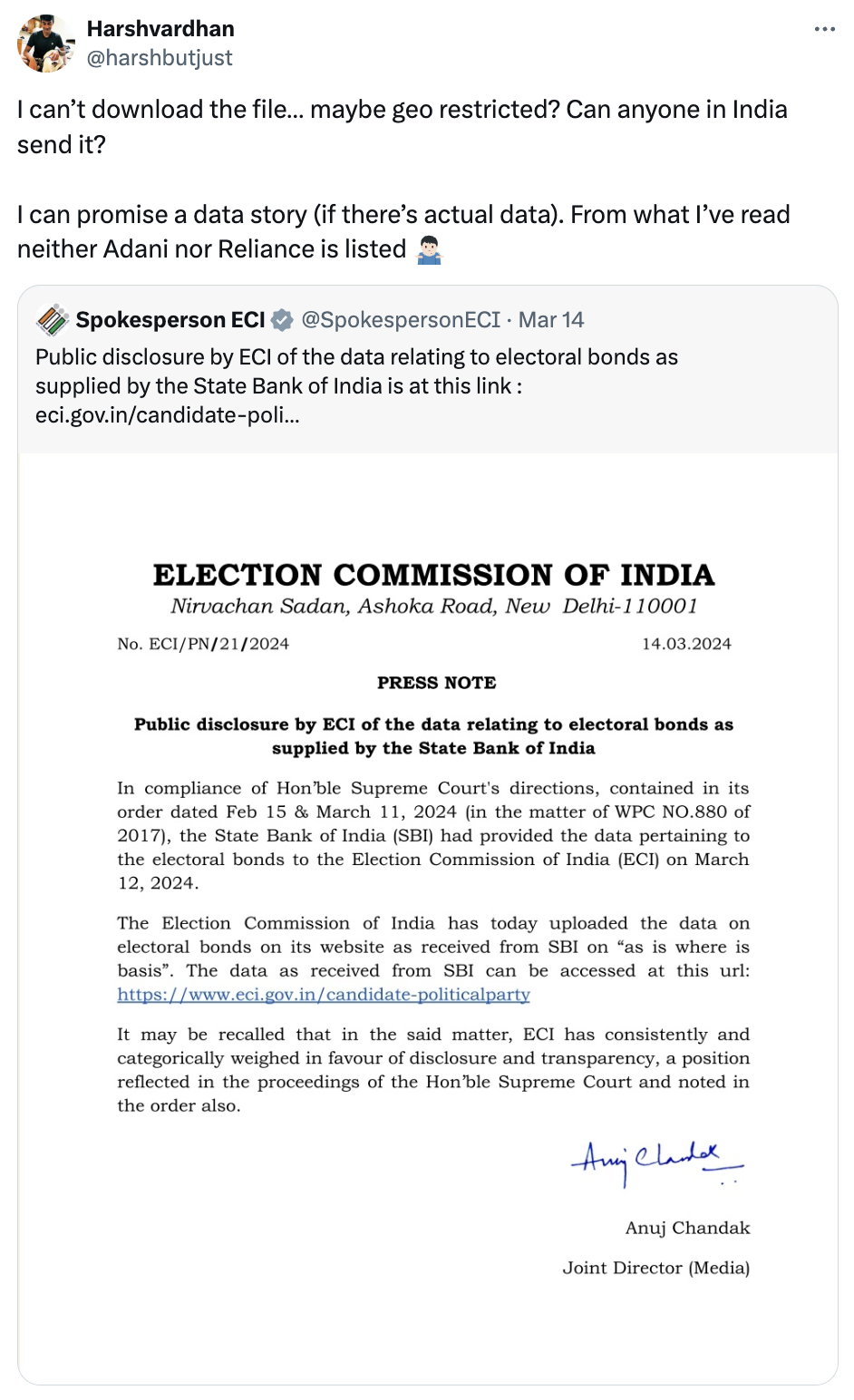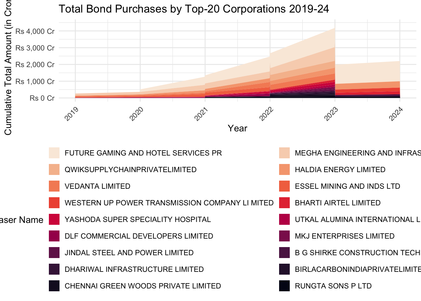 - For this analysis, I used the raw data which you can access here. https://github.com/harshvardhaniimi/personal-website/blob/fe7f928810a8e883a6507bd3c4c602a0d2c69854/content/blog/2024-03-15-who-s-funding-the-politics-in-india/Electoral%20Bonds%20Raw%20Data.xlsx