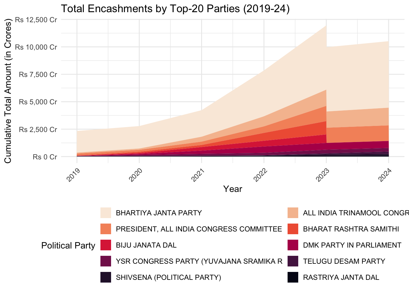 For the starters, we can find which parties benefitted the most from the scheme. Even without looking at the data, I can say it would be the ruling party BJP as it is the largest party, incumbent, initiated the scheme, and generally friendly to corporate interests.